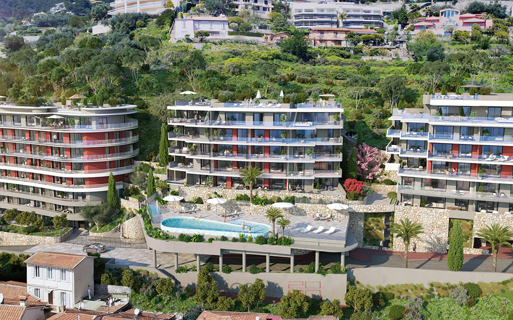 Aux Voiles du Cap, adresse intimiste et exclusive dans le quartier de Saint Roman à la frontière monégasque, bel appartement de 4 pièces de 79 m² avec une terrasse privative de 42 m².